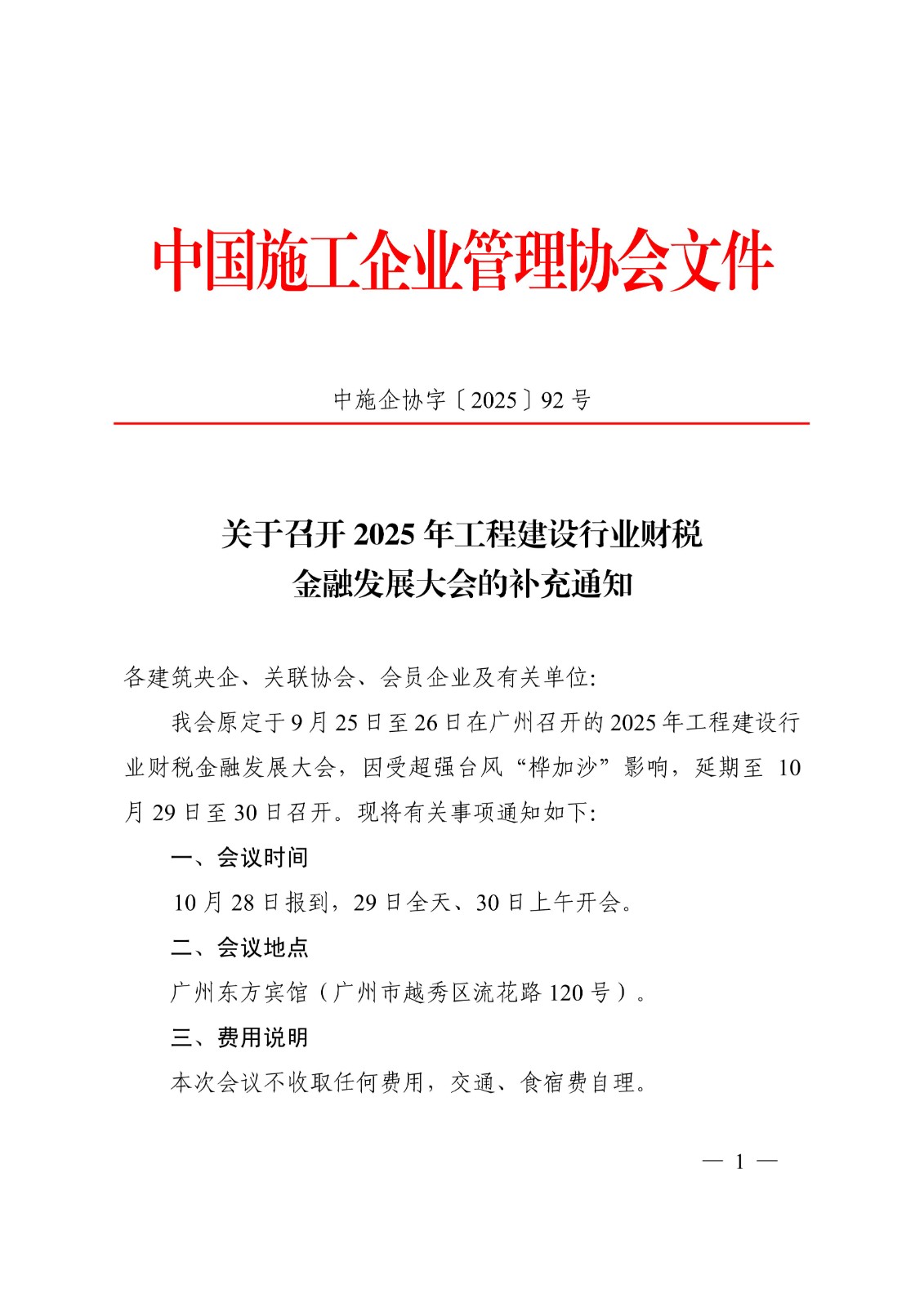 转发中国施工企业管理协会关于召开2025年工程建设行业财税金融发展大会的补充通知