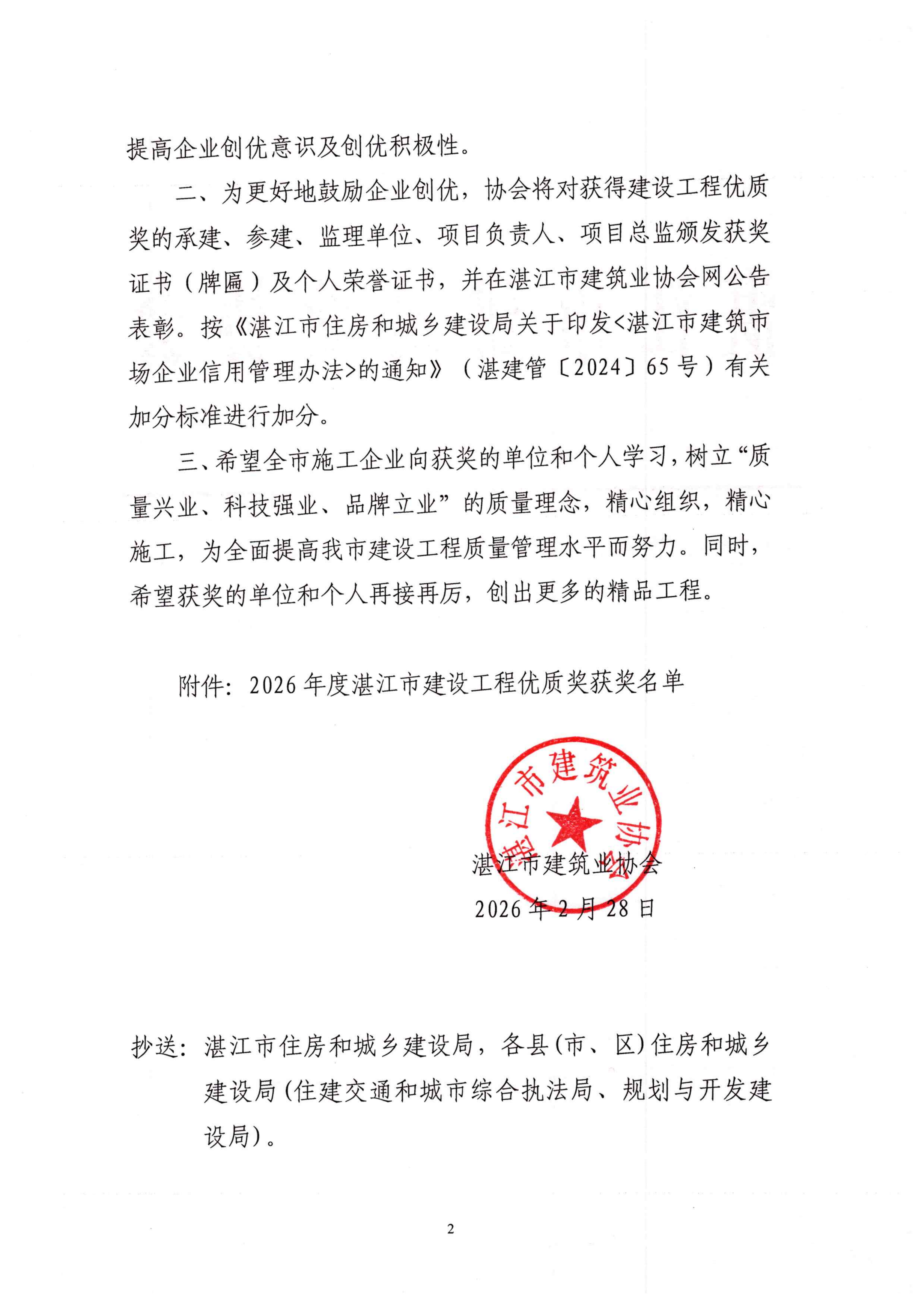 湛江市建筑业协会关于2026年度湛江市建设工程优质奖评选结果的通知